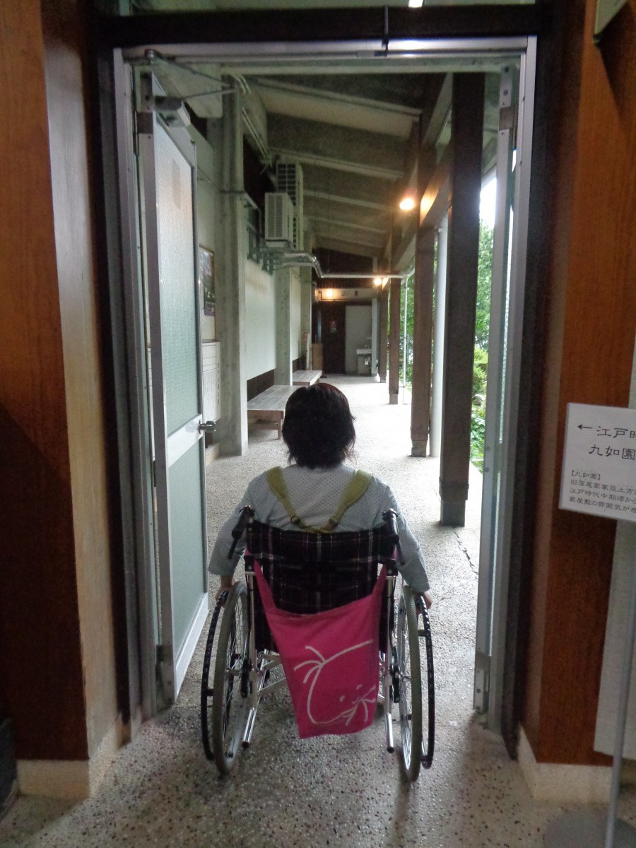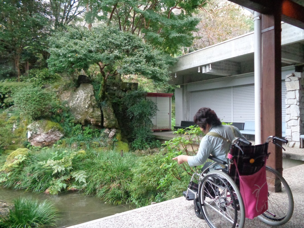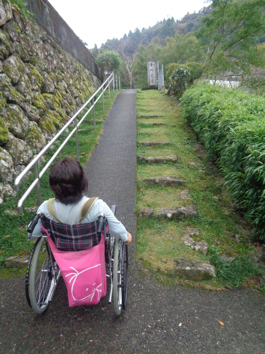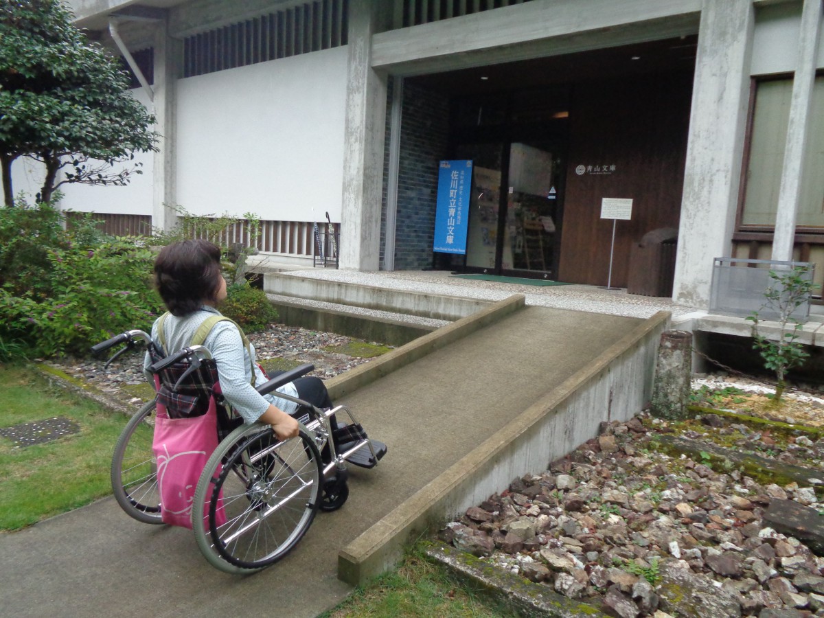 建物までのスロープは急な坂のため、介助者は2名以上いると安心