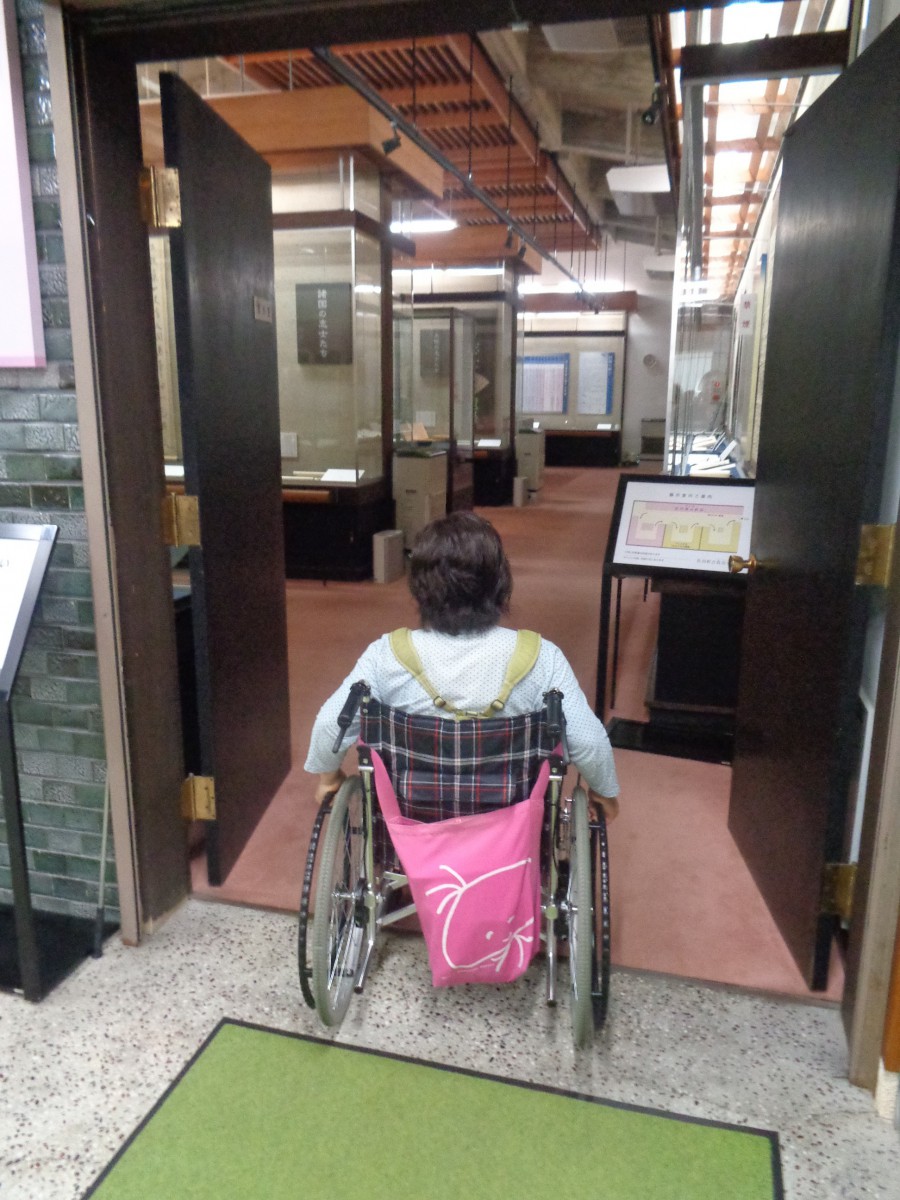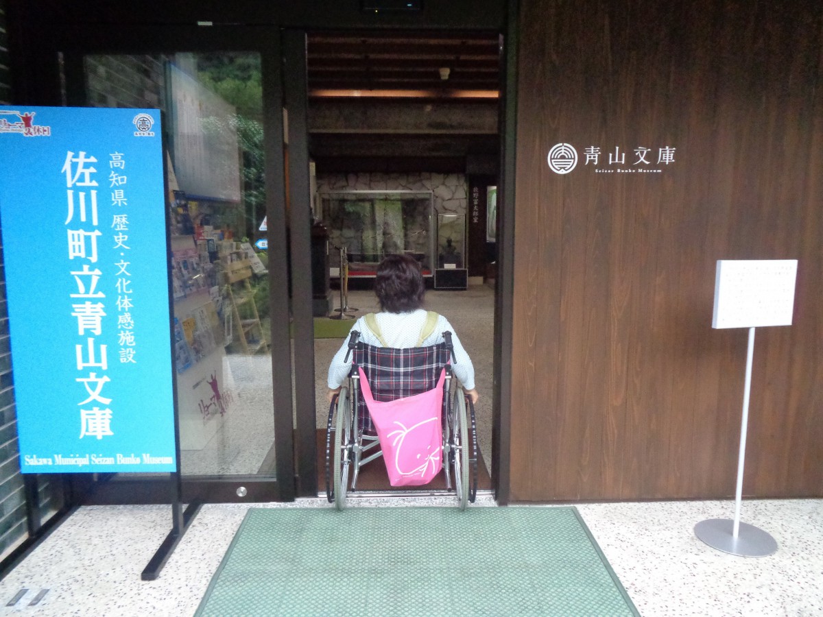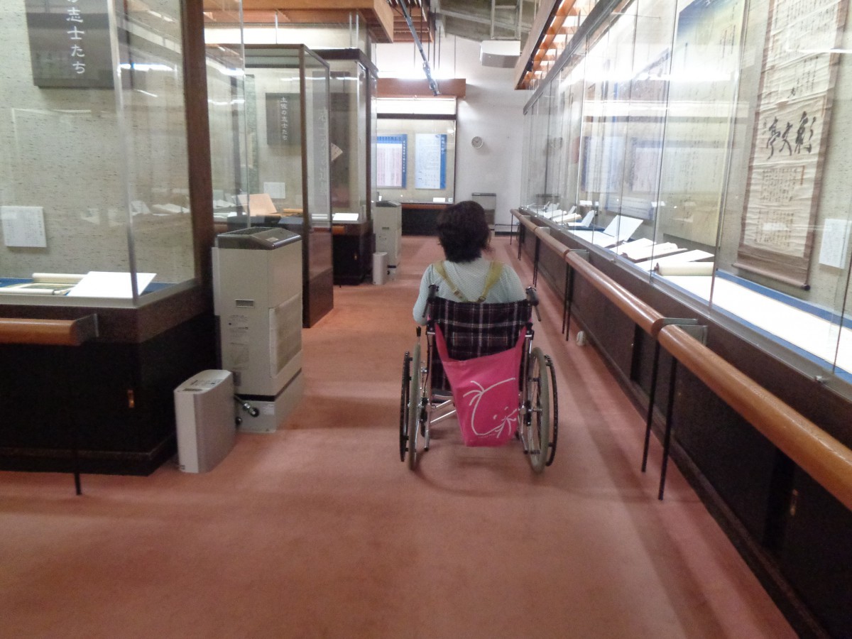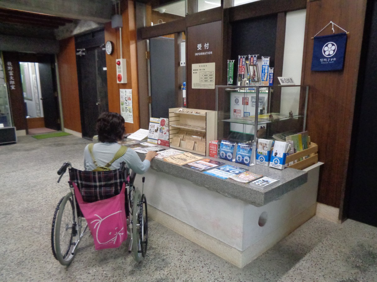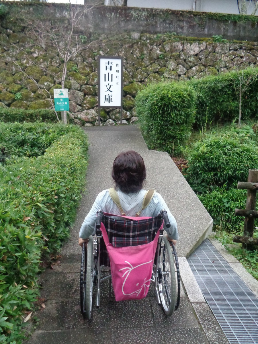建物までのスロープは急な坂のため、介助者は2名以上いると安心