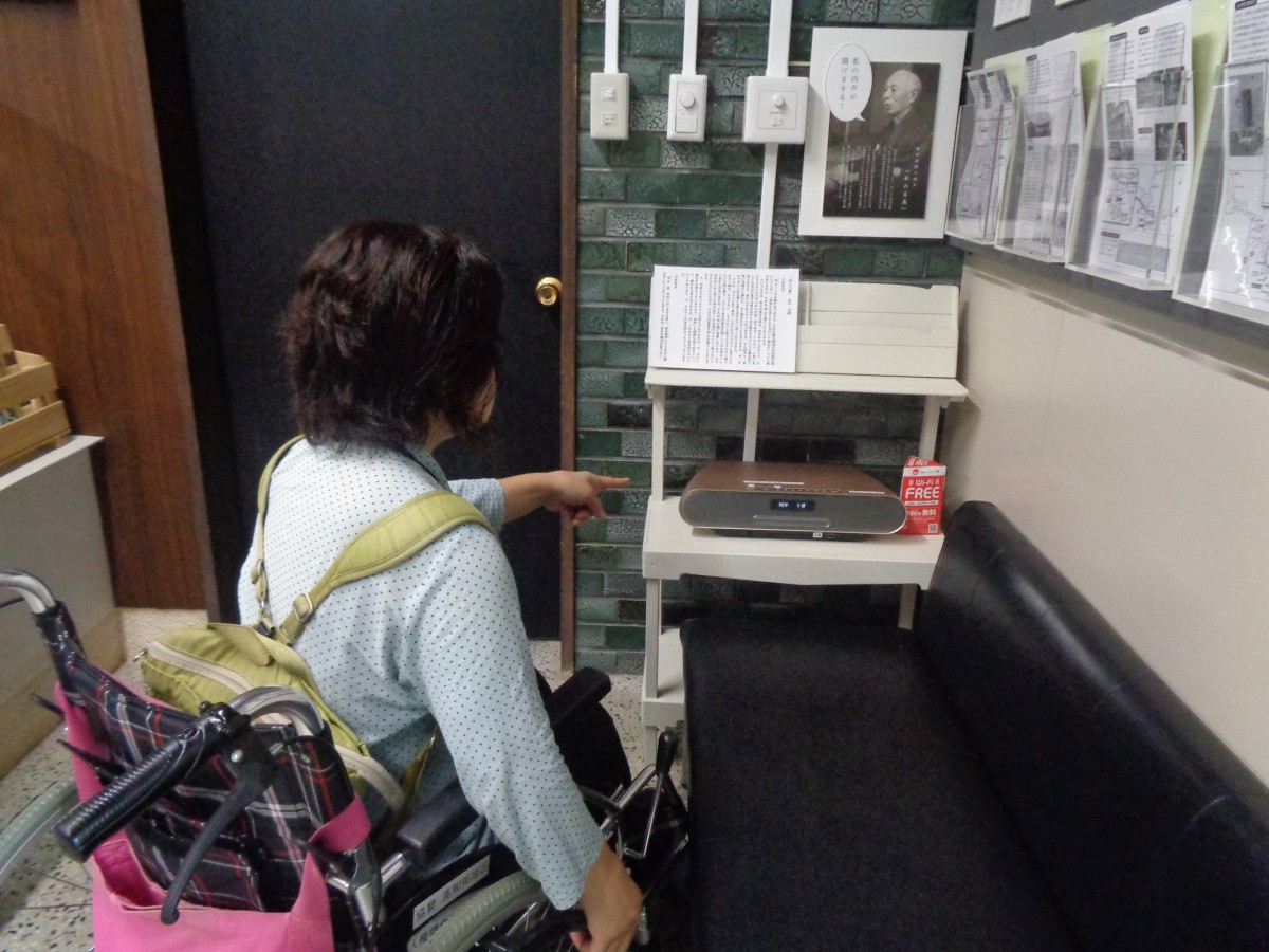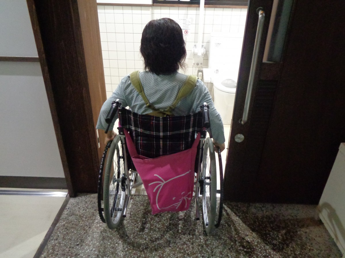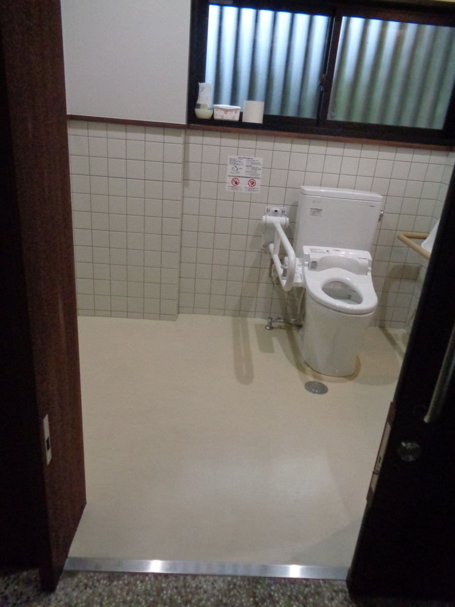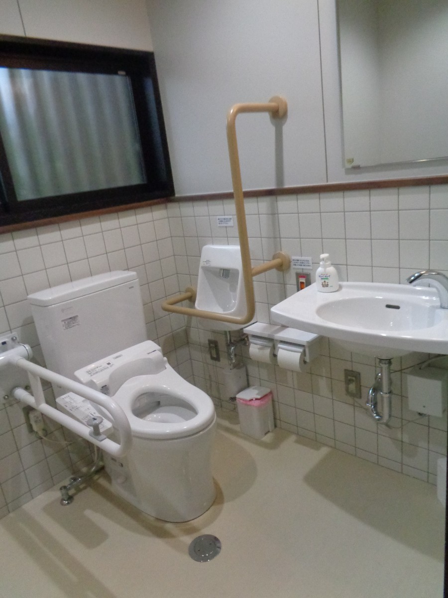 車いす対応トイレ内 車いすの回転できる十分な広さ 雨天時や湿気の多いときは床面が滑りやすいため注意が必要