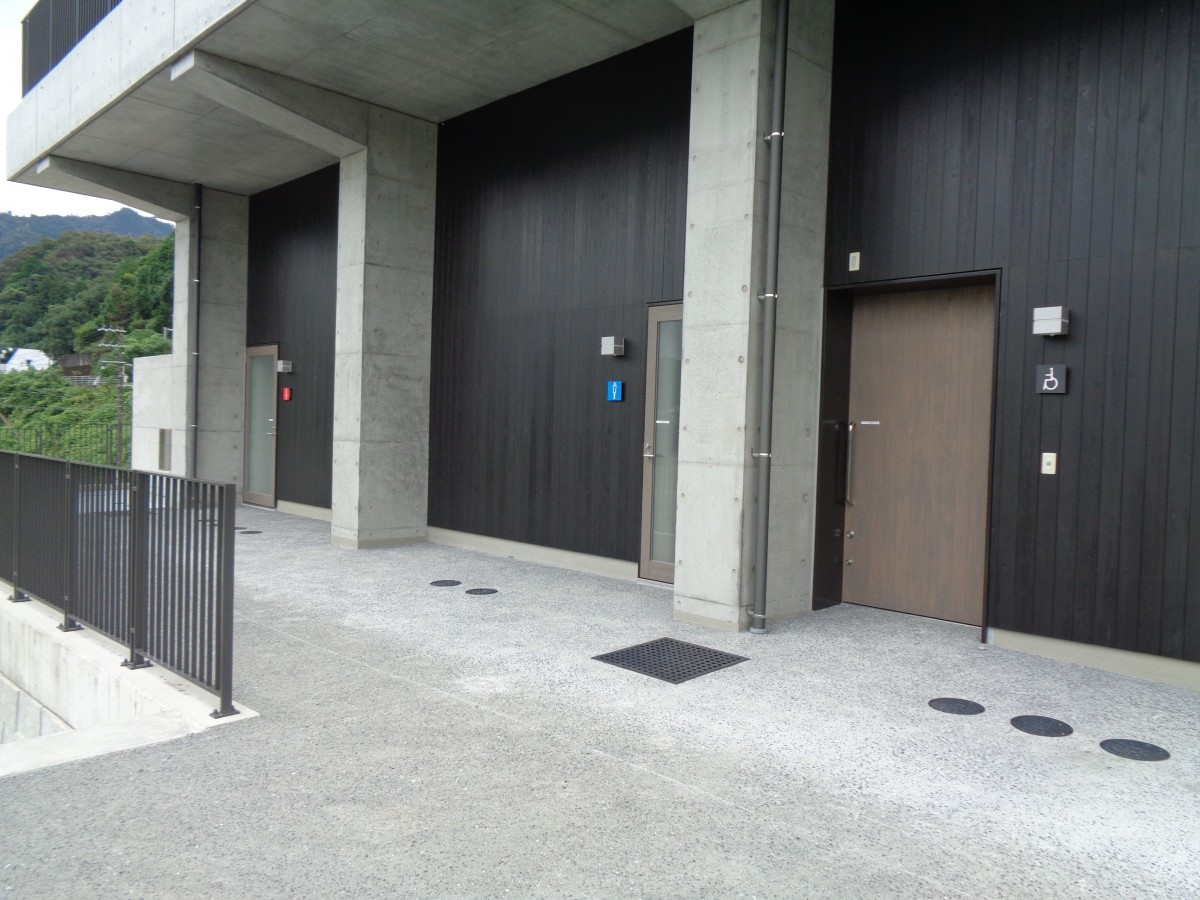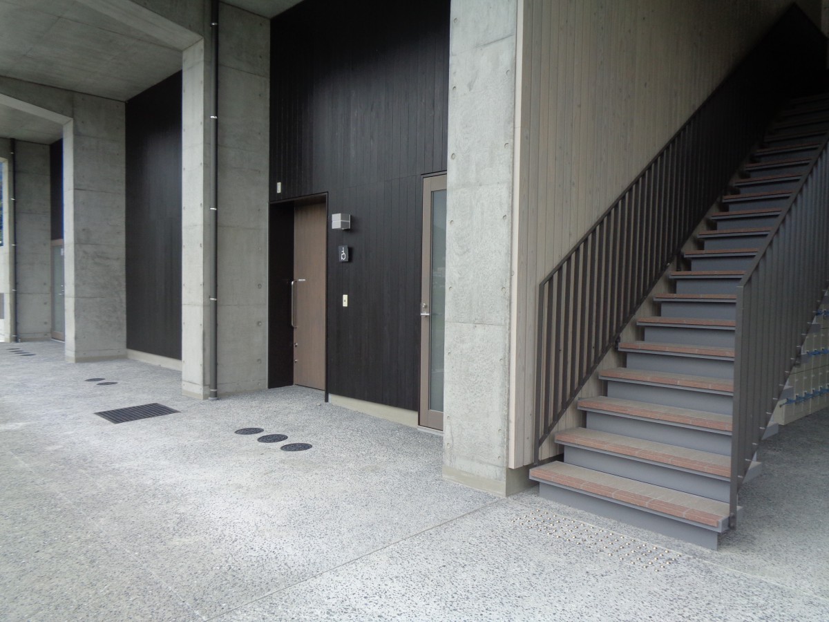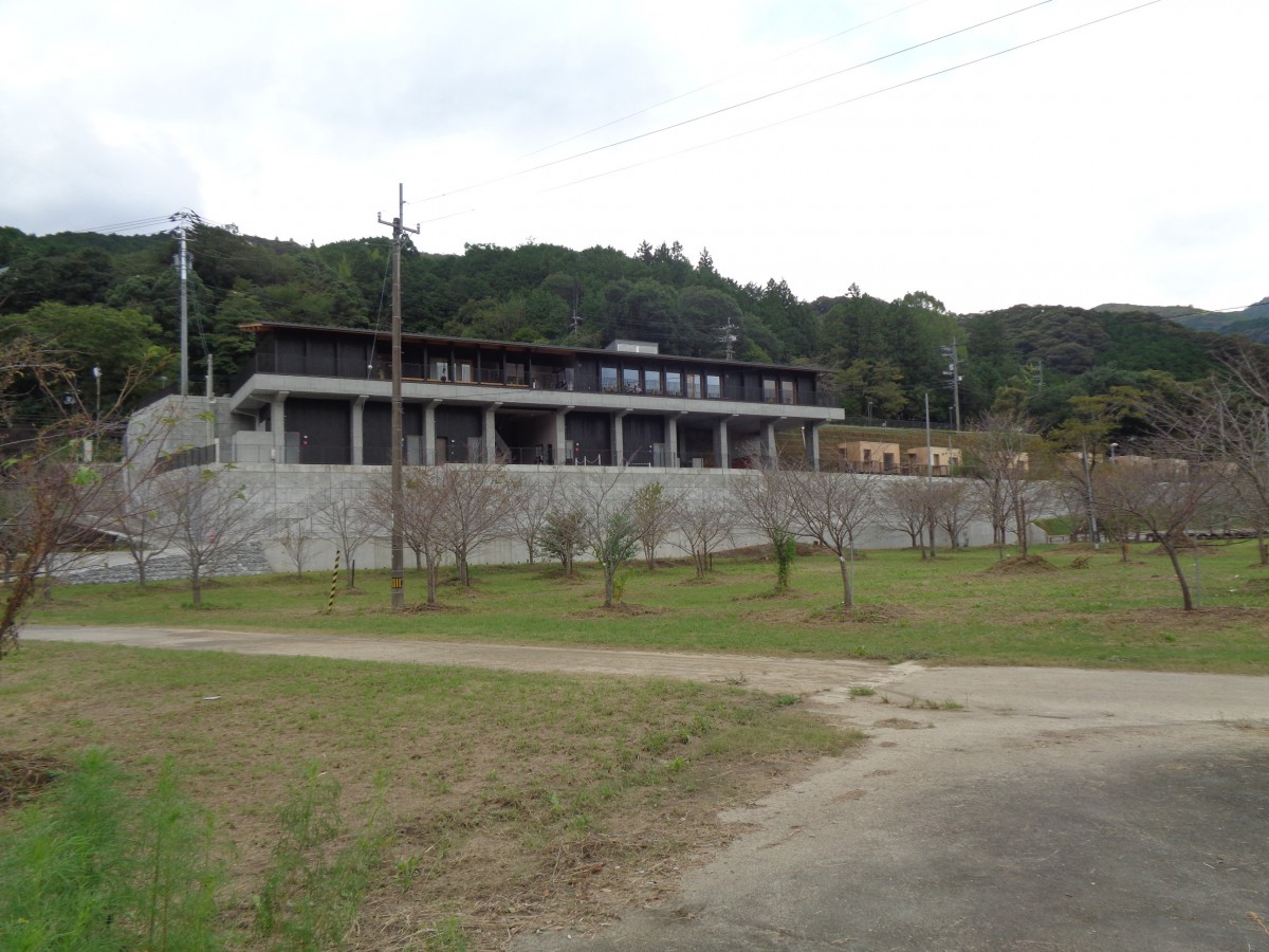 建物を駐車場の反対方向から見た様子 斜面を利用した建物で、駐車場は2階にあたる