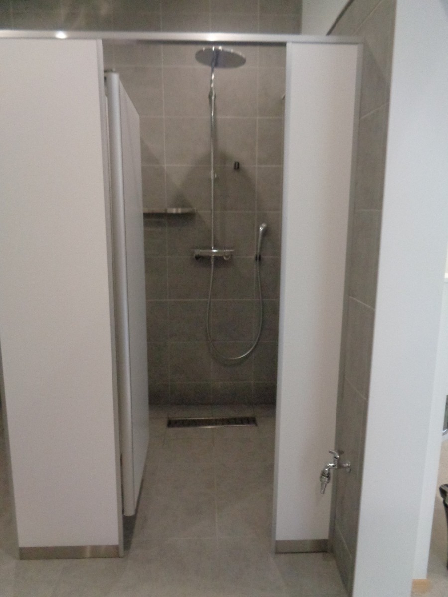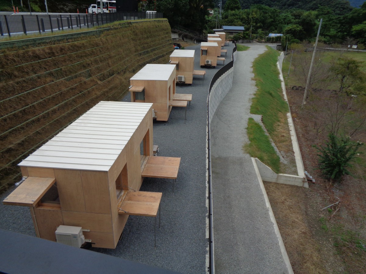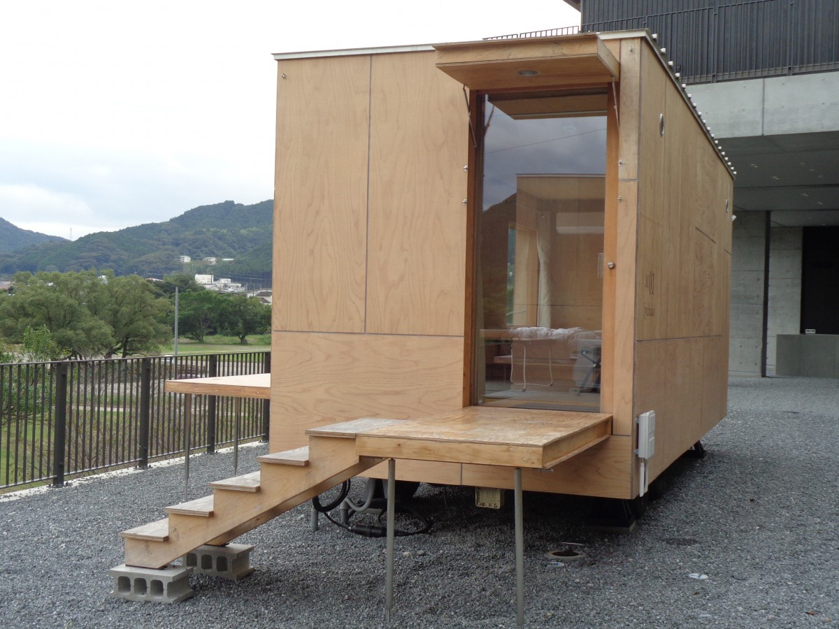 トレーラーハウス住箱 建築家隈研吾氏のデザイン。トレーラーハウスのエリアは通路は砂利が敷設されている。砂利は車いすでの通行はしにくい