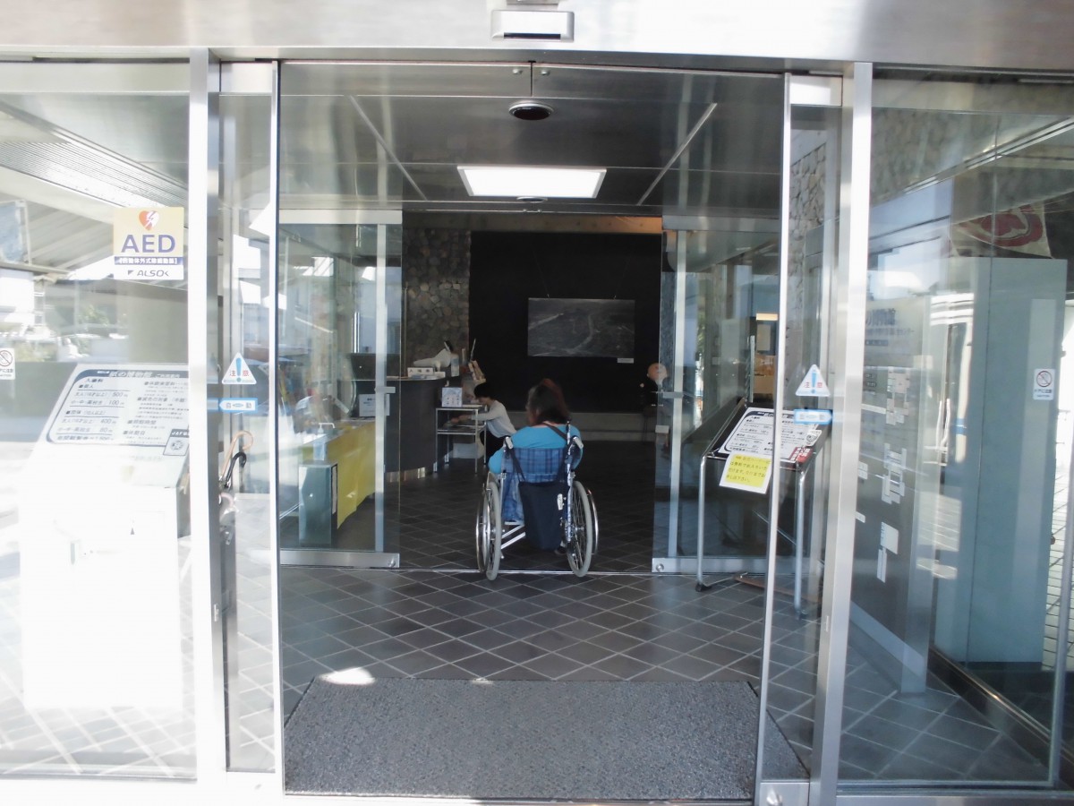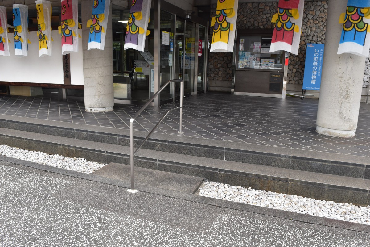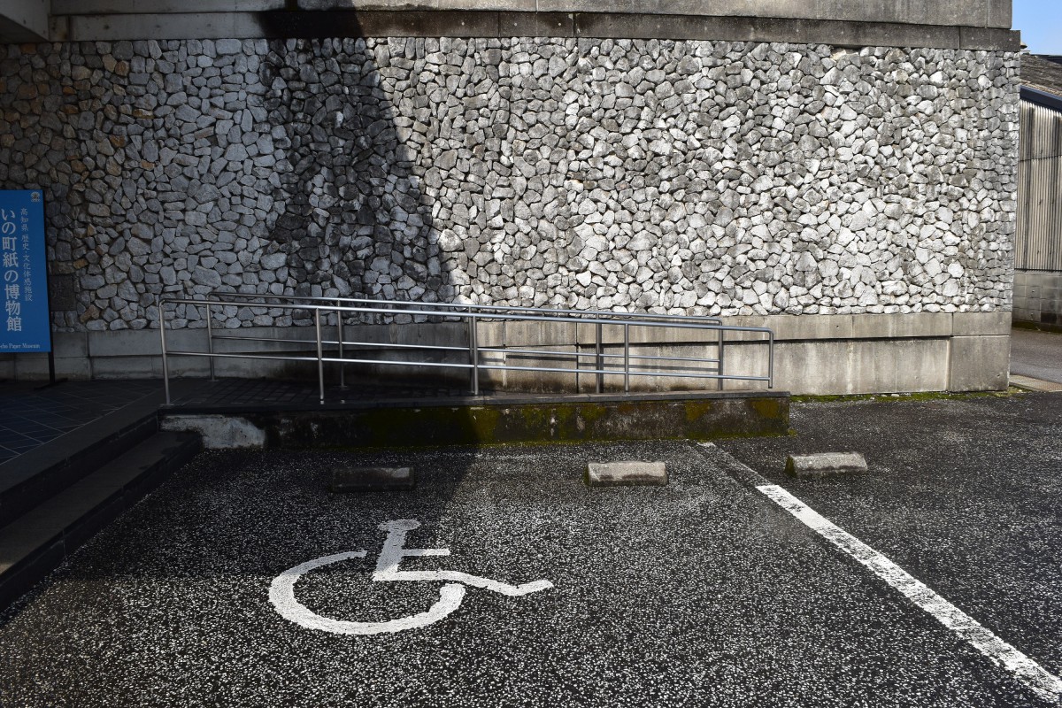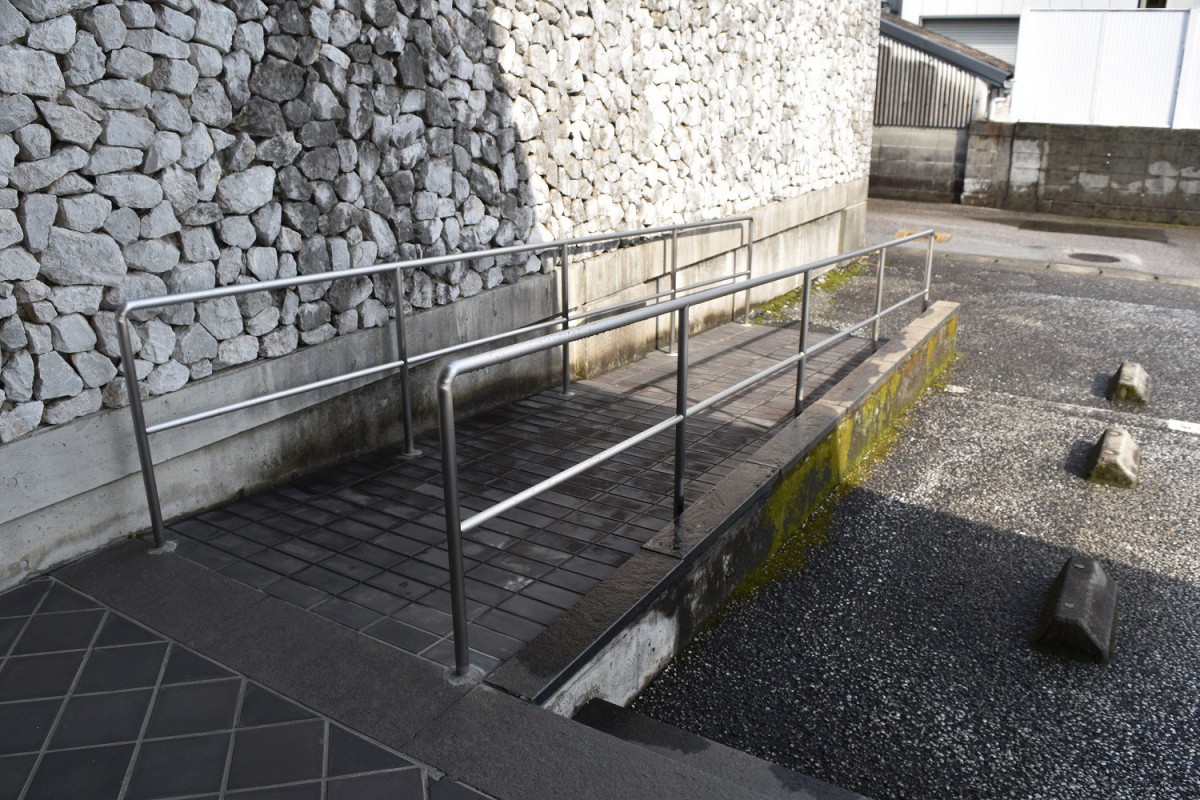 障害者専用駐車場から正面玄関へのスロープ 傾斜5度 両側に手すりあり