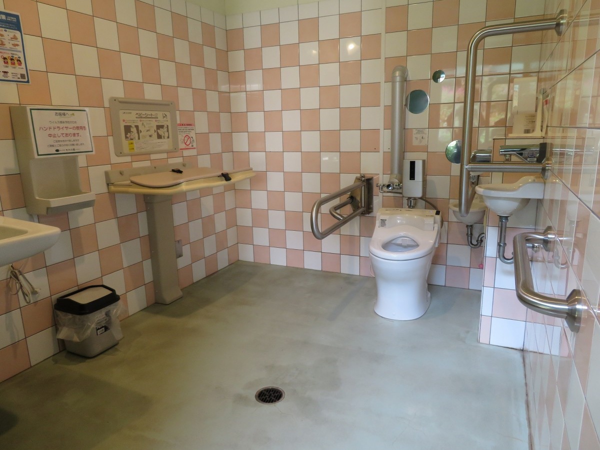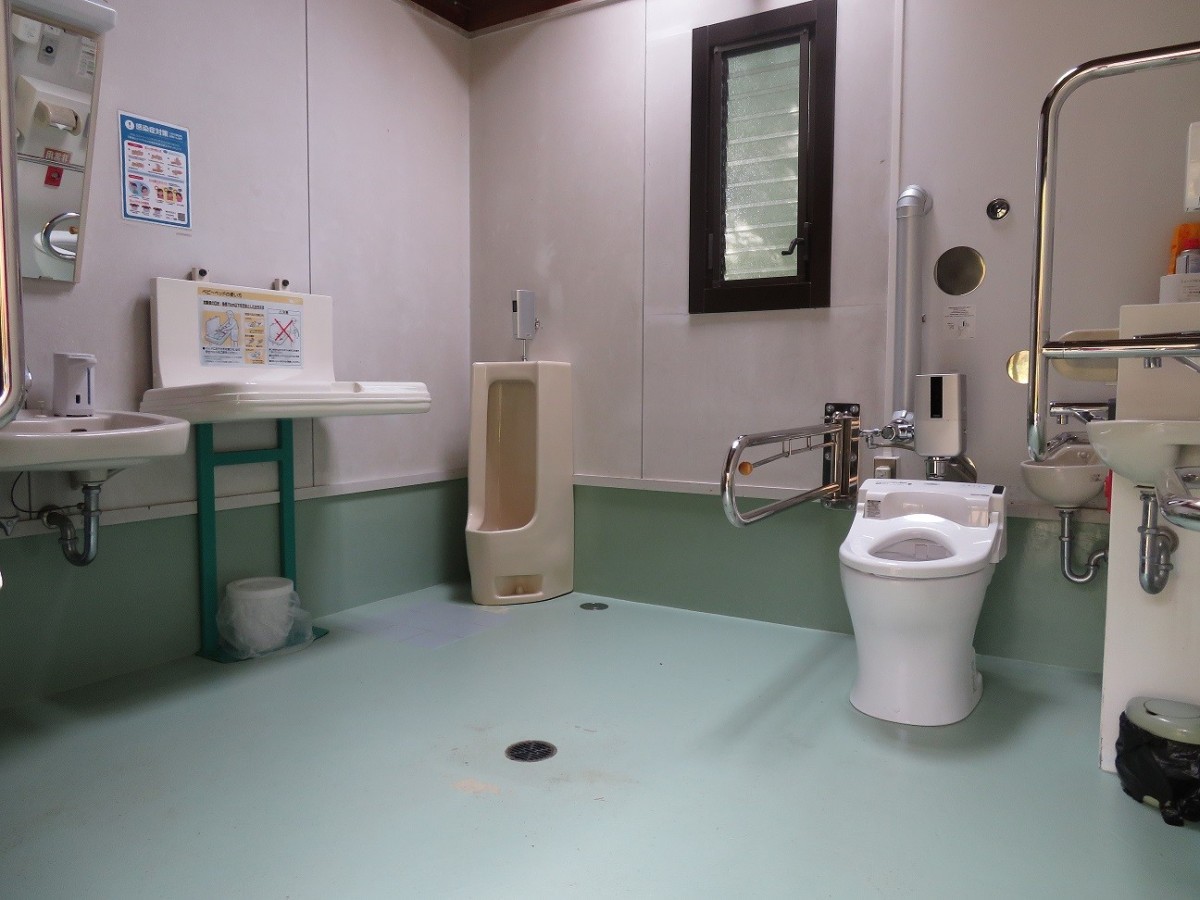 多目的トイレ(遊びの森の手前) 便器に向かって、右側にL字固定、左側にU字可動式手すりあり ベビーシート、小便器あり ※R3.11撮影