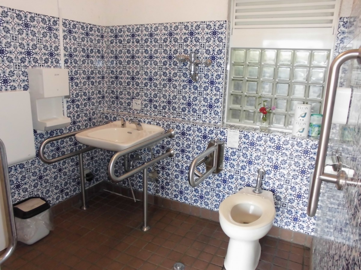 多目的トイレ(手づくり工房隣) 便器に向かって、右側にL字固定、左側にU字可動式手すりあり ベビーシートあり ※R3.11撮影