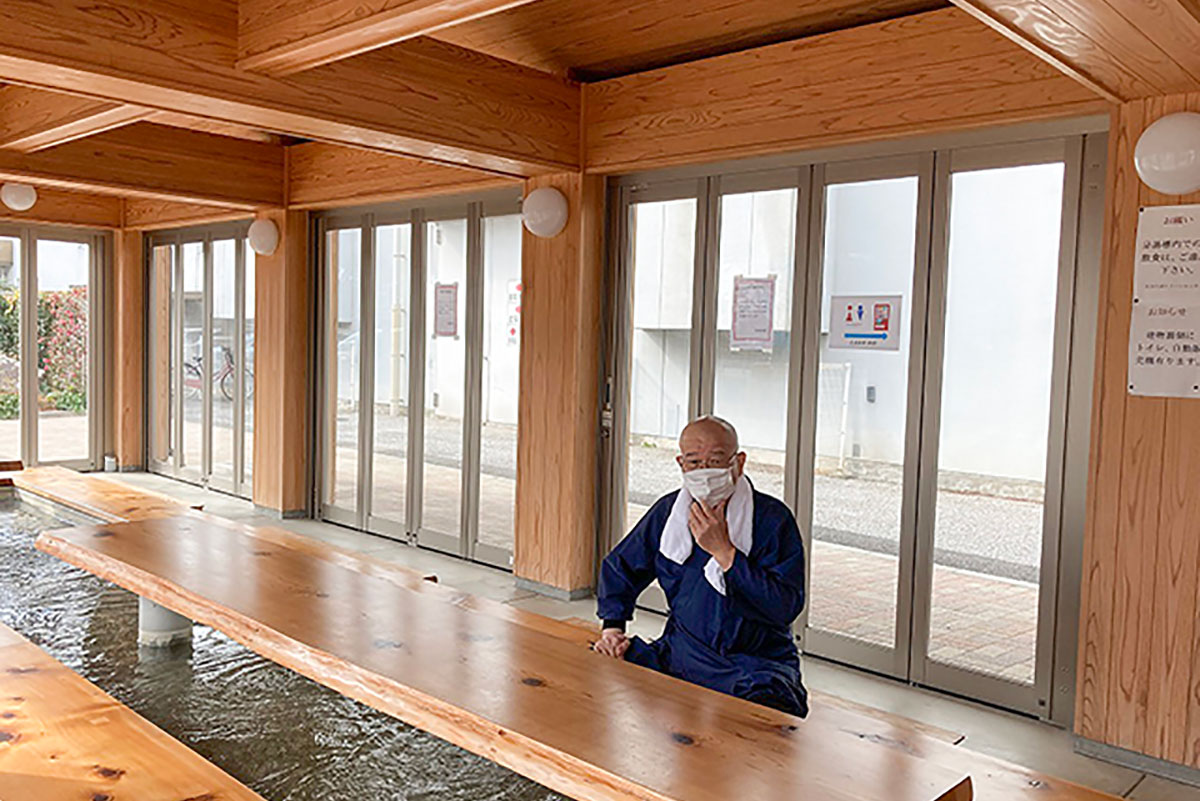 ごみ処理施設「まほろばグリーンセンター」内で焼却時のエネルギーを利用した足湯「まほろばの湯」で足湯を体験しました。