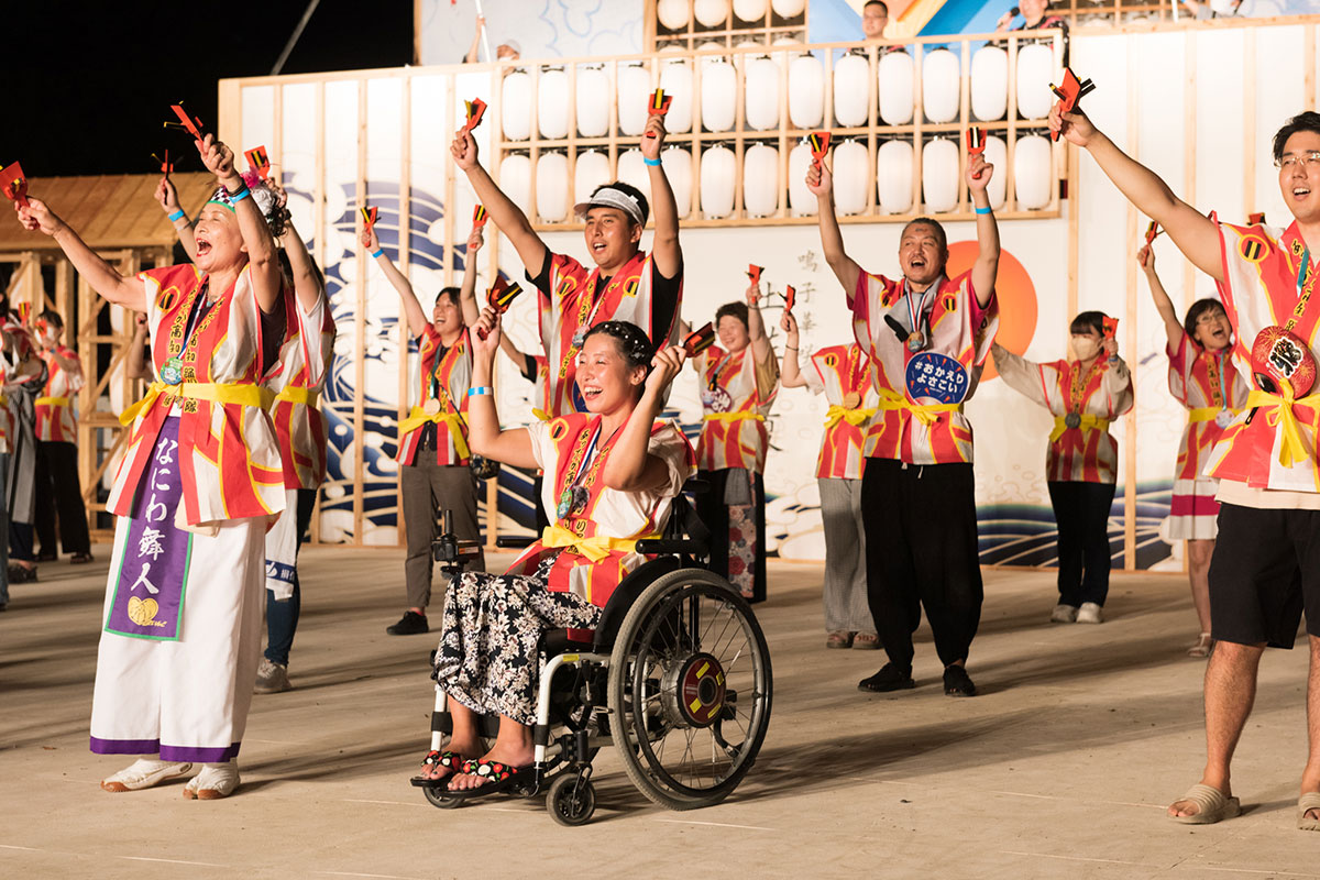 次は、大通りを歩行者天国にした全長約350メートルの追手筋本部競技場。今回は、電動車いすを自分で操作しながら、少しずつ進みながら踊りました。チームの一体感や祭りのエネルギーを全身に浴び、元気と自信をもらい気持ちは「高知にぞっこん」!