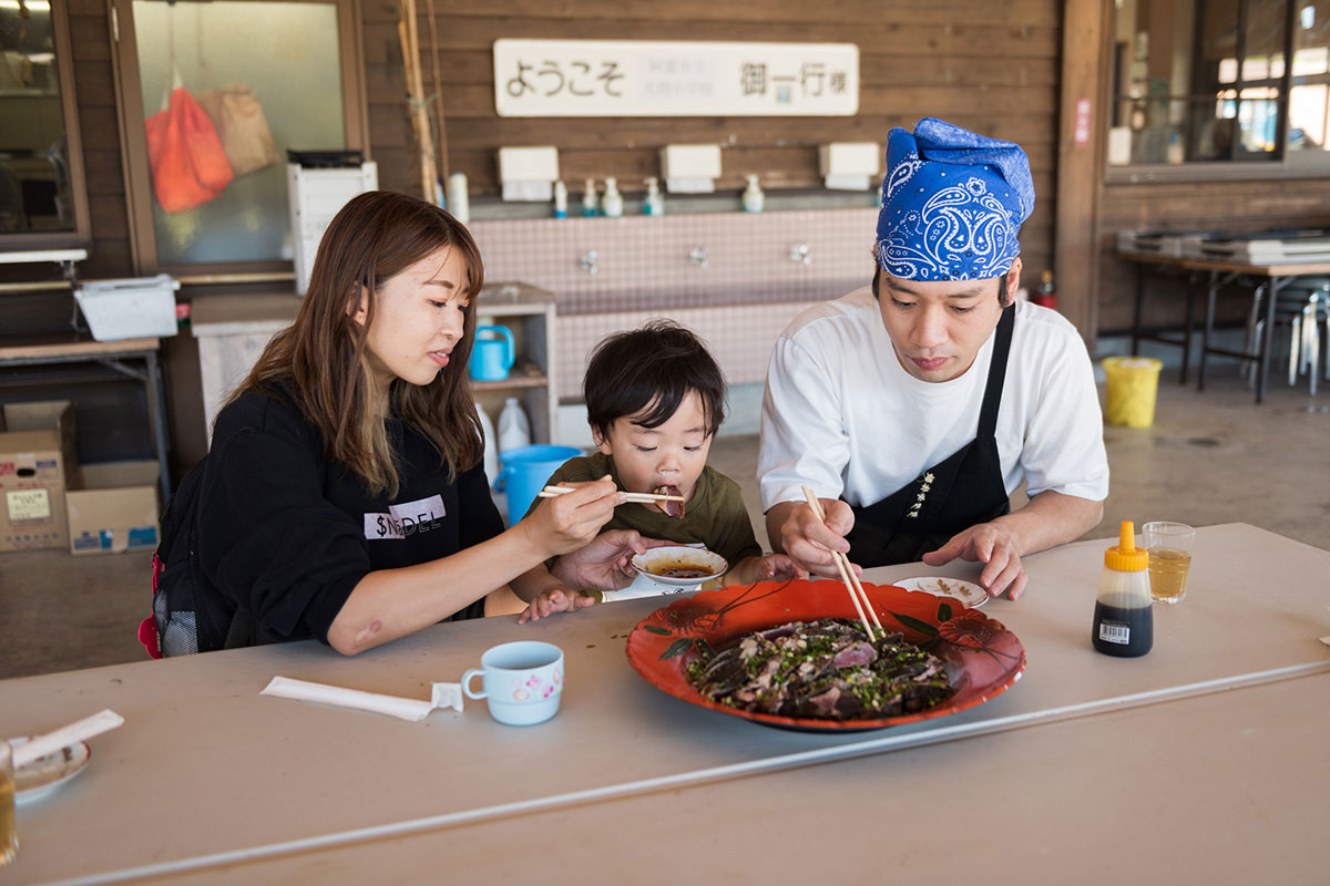 カツオふれあいセンター黒潮一番館では、その日に水揚げされた新鮮なカツオを1本丸ごと使って、「さばく」「焼く」「食べる」が体験できます。