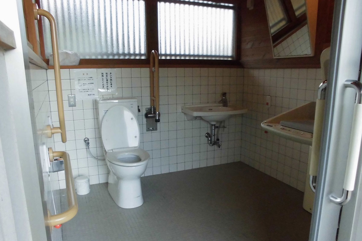 釣り場近くには公衆トイレがあり、手すり付き洋式トイレやベビーチェアが完備。多目的トイレ内にはベビーシートと幼児用トイレが設置されています。