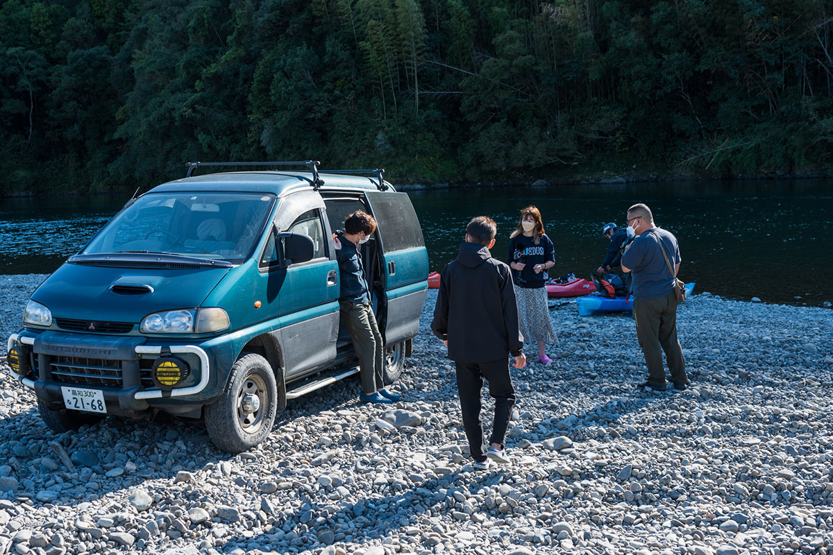 施設から河原の通行は、車いすでは困難なため施設の車で移動。カヌー乗降時は、スタッフのサポートがあります。