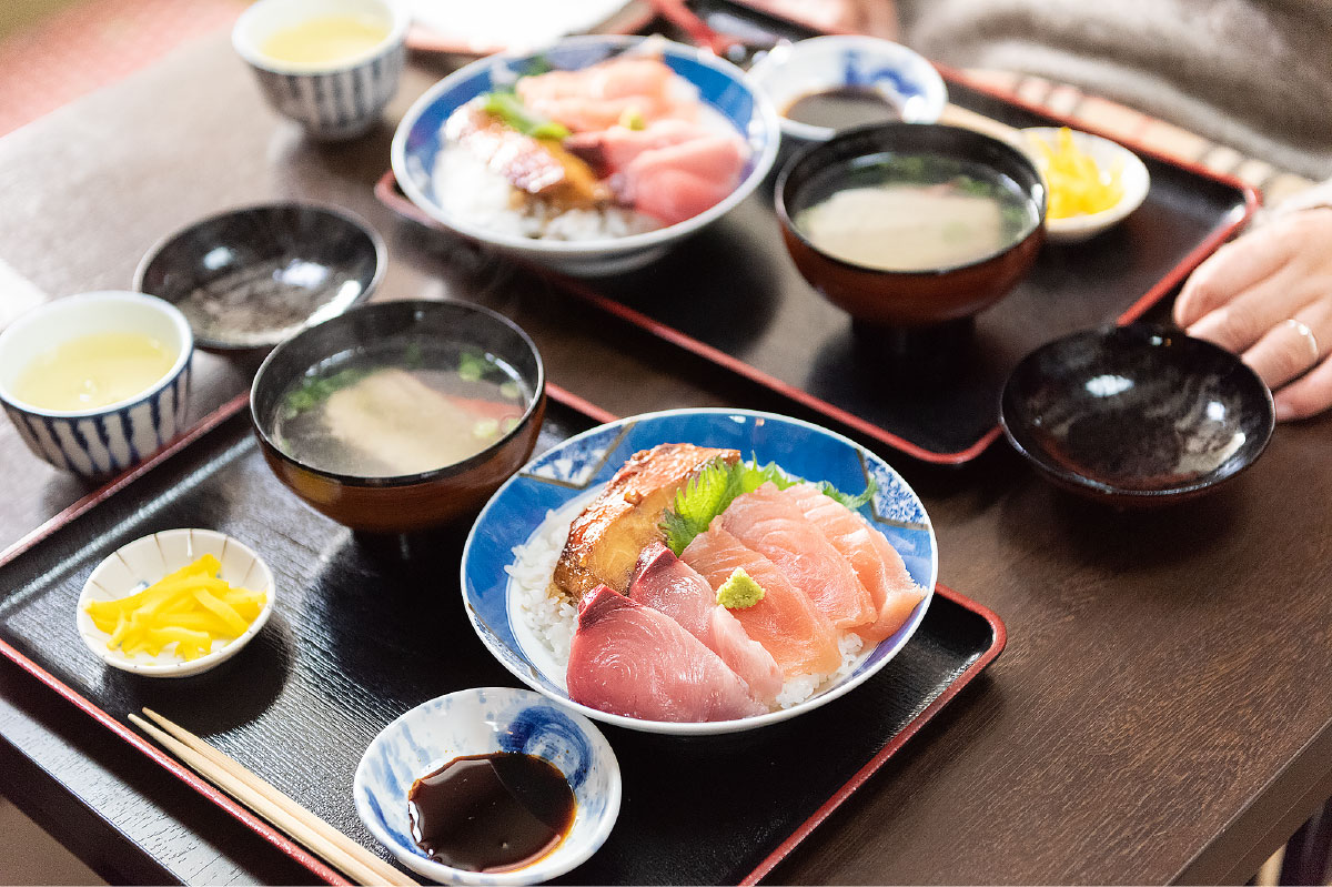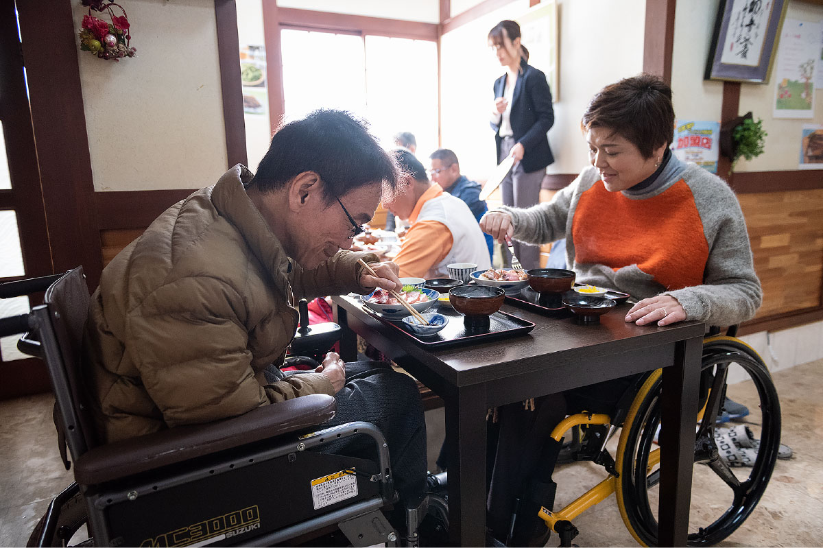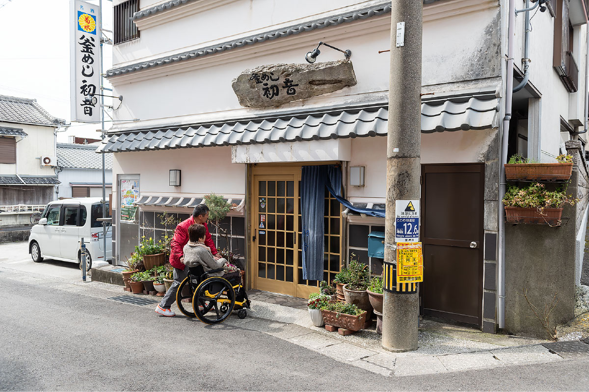 昼食は室津港近くの老舗、釜めし初音でキンメ丼をいただくことに。入口はスロープ状のコンクリートで少し傾斜あり。手動の車いすでは介助が必要な場合もあるかも知れません。また、幅がちょうどなので、電動車いすの場合はぶつからないよう注意が必要です。店内のスペースは十分で、車いすでも食べやすいよう、テーブルを用意してくれていました。また、持ちやすいフォークも。テーブルは車いす利用者には重要で、足が入るかどうか心配ですが、こちらの場合は手動車いすであれば、ほとんどどの方がOKだと思います。そして何よりキンメ丼のおいしさと言ったら! 食べていただくしかないです! なお、トイレは車いす対応トイレではないです。