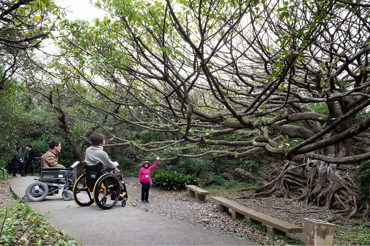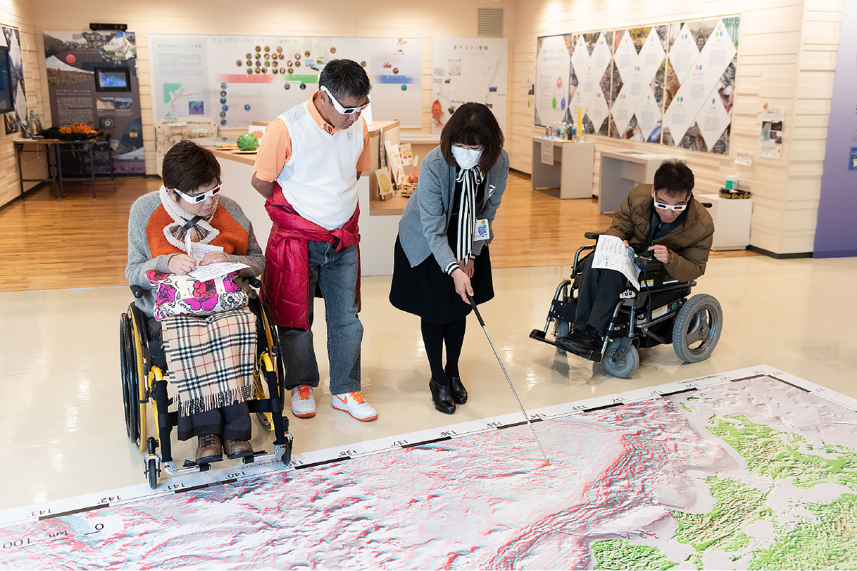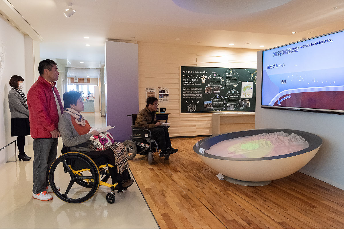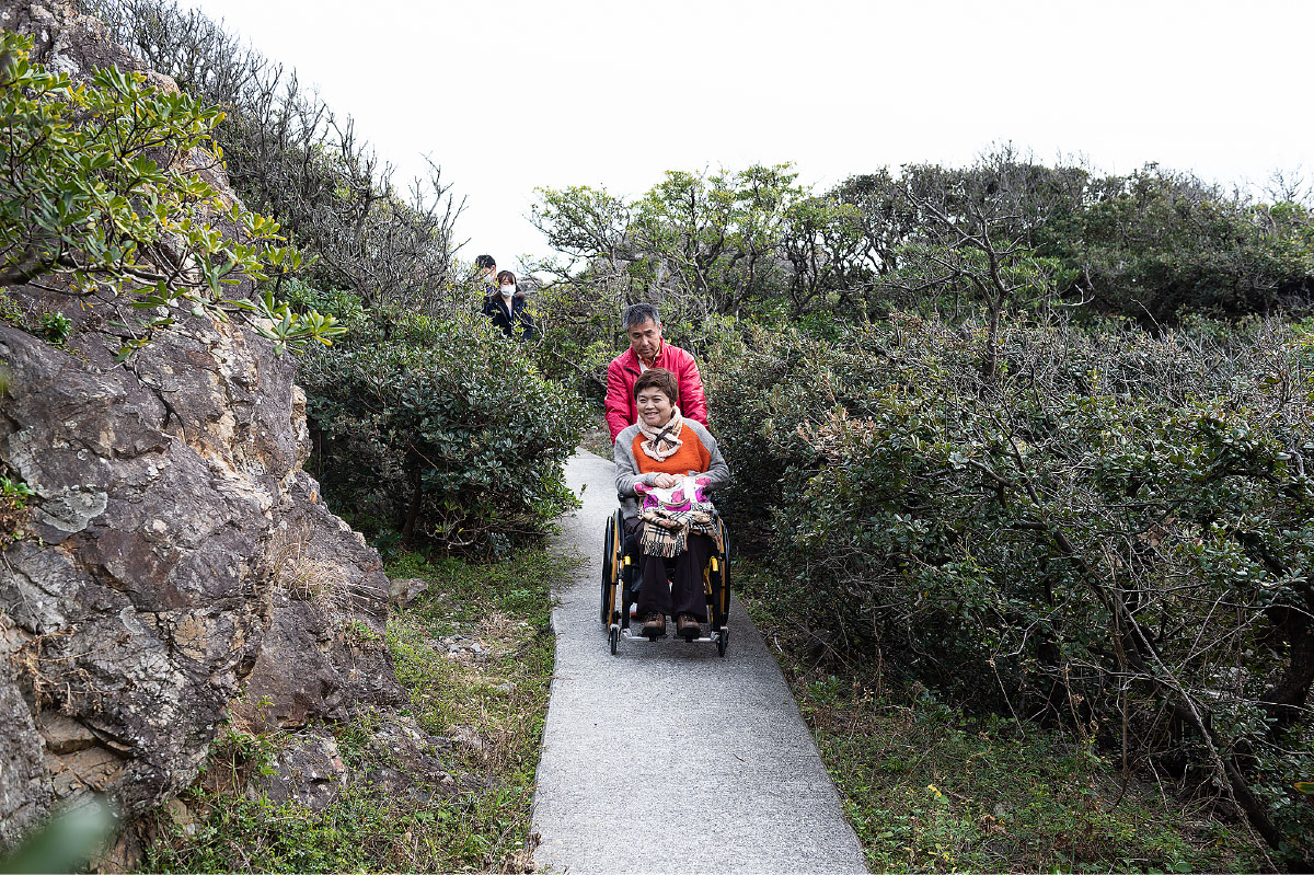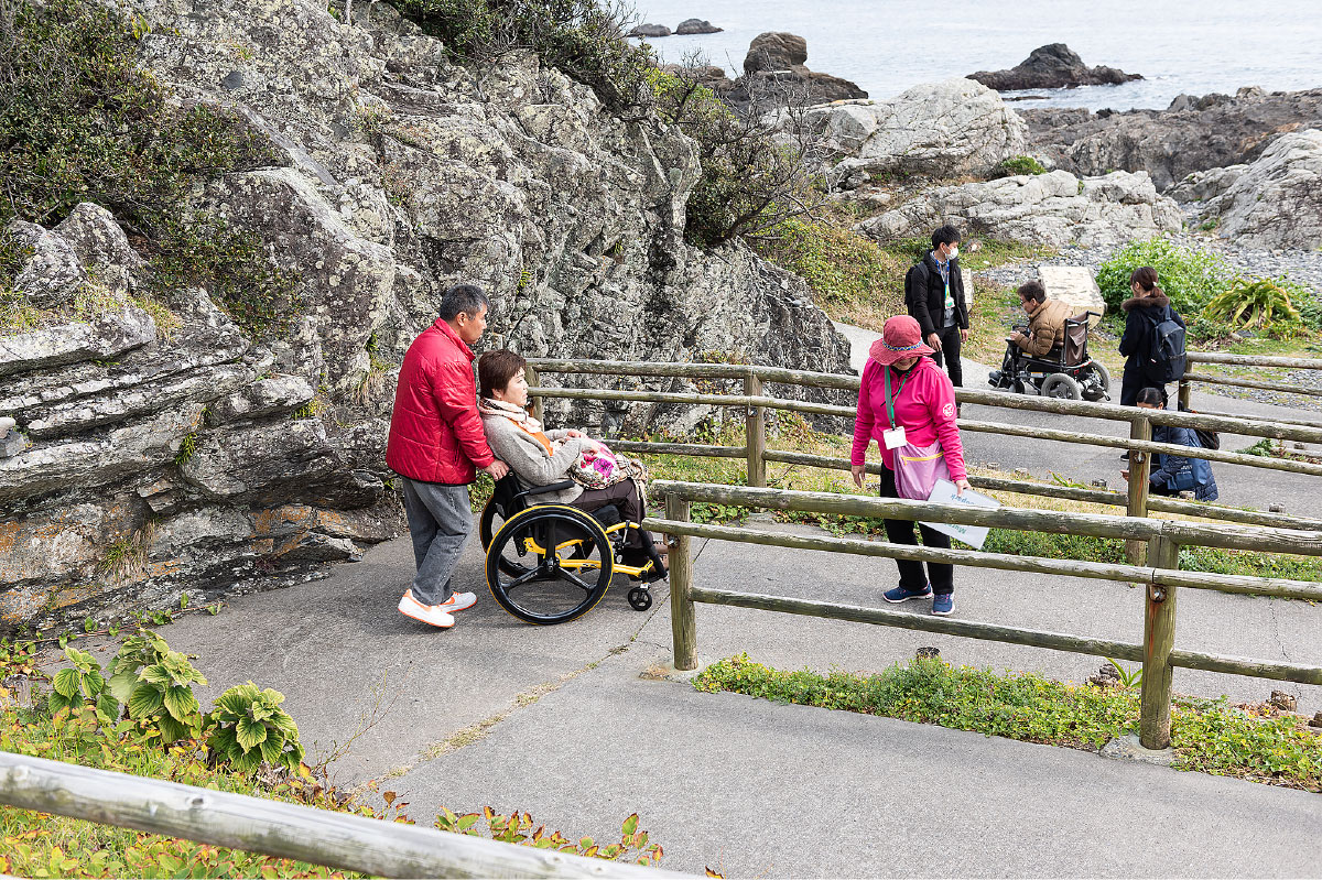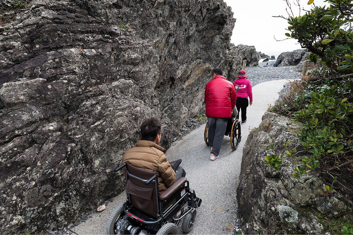 岩ばかりで車いすでの移動は難しいイメージのあるジオパークですが、介助者付きであれば予想以上に移動可能です。ガイドさんにコースを選んでいただき、説明を聞きながら散策しました。迫力ある岩の隆起や大地の営みを感じるには十分なコース。車いす利用のモニターの方は、ほとんど行けないだろうと思っていたらしく、大満足でした。しかし、やはり自然の中の散策路なので、車いす一人での移動は転倒の危険もあり、避けたほうがよいです。必ず介助者の方と一緒に行くようにしてください。
