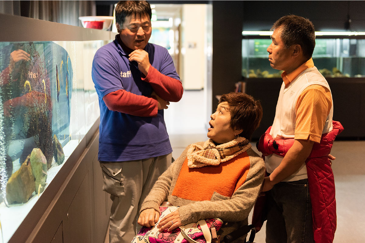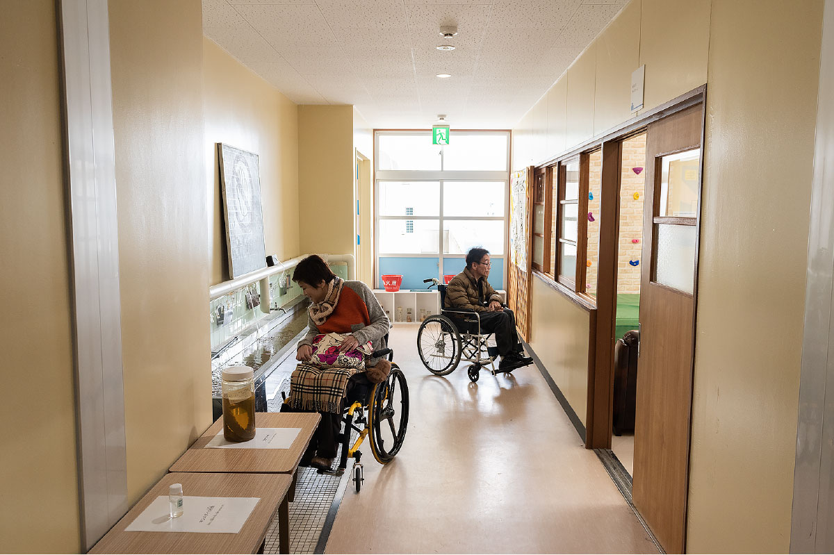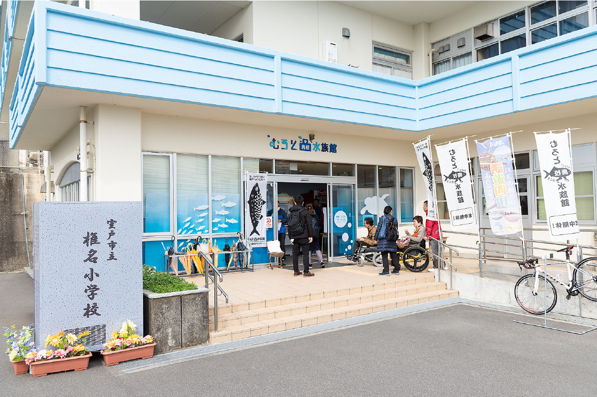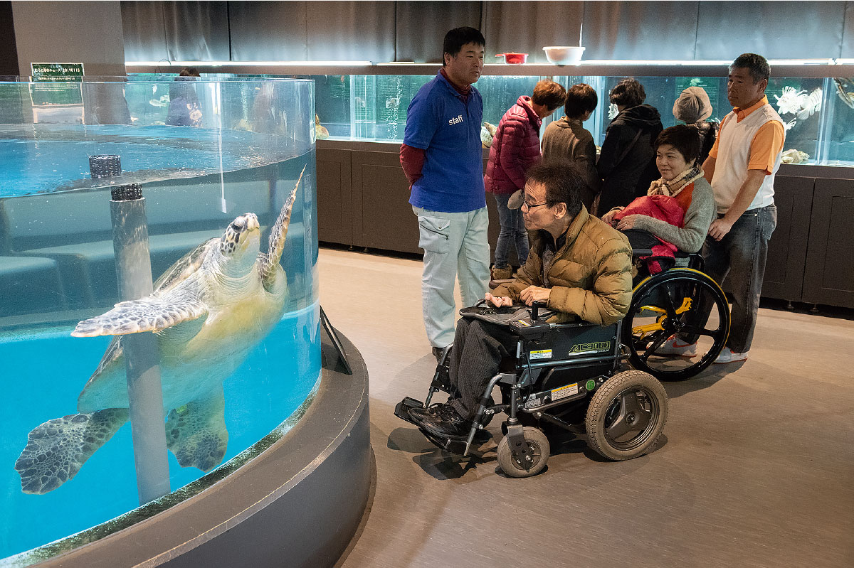 安芸駅からウェルキャブに乗換え、室戸を目指します。むろと廃校水族館は、その名の通り廃校になった椎名小学校を改修した水族館ですが、入口にはスロープがあり、2階の展示室まではエレベーターで上がることができます。ただ、2階から3階へ上がるには階段しかなく、4人がかりで車いすごと持ち上げなければなりません。かつての小学校の雰囲気は3階がもっとも残っていますが、2階まででほぼ全部の魚が見学できるので、3階まで行けない方も十分楽しめると思います。今回は館長に案内していただきましたが、とても親切で情熱的、説明も良く理解できました。全ての教室(展示)に考えや想い、工夫があり、すばらしい! プールで泳ぐサバやサメ、ウミガメ等の展示は2階の外階段か、一度館外に出て職員用の通路をからプールサイドに出れば見ることができます。職員の方に相談するとよいです。また、2階には車イス用トイレがあり、使いやすいです。