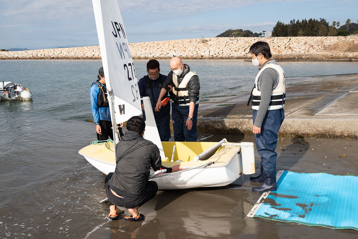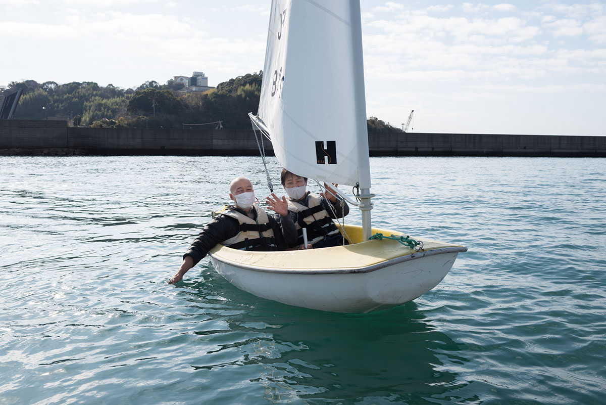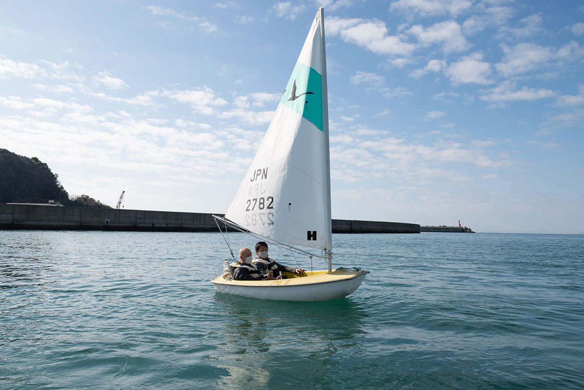 濡れないマリンアクティビティとしてハンザクラス(ヨット)を体験しました。ウェーダーへの着替えは必須ではなく、肢体に障害があり着替えが難しければ直接ライフジャケットを着て体験しても可(乗降時や水しぶきなどで多少濡れる可能性あり)。操作方法は簡単で気軽に体験できますが、視覚障害がある場合は、風向きや帆の向き、進行方向の認知と判断はコツをつかむまで難しいかもしれません。風に吹かれて波間にのんびり漂っている感じや、ヨットの縁から伸ばした手で速さや海の温度を感じられます。