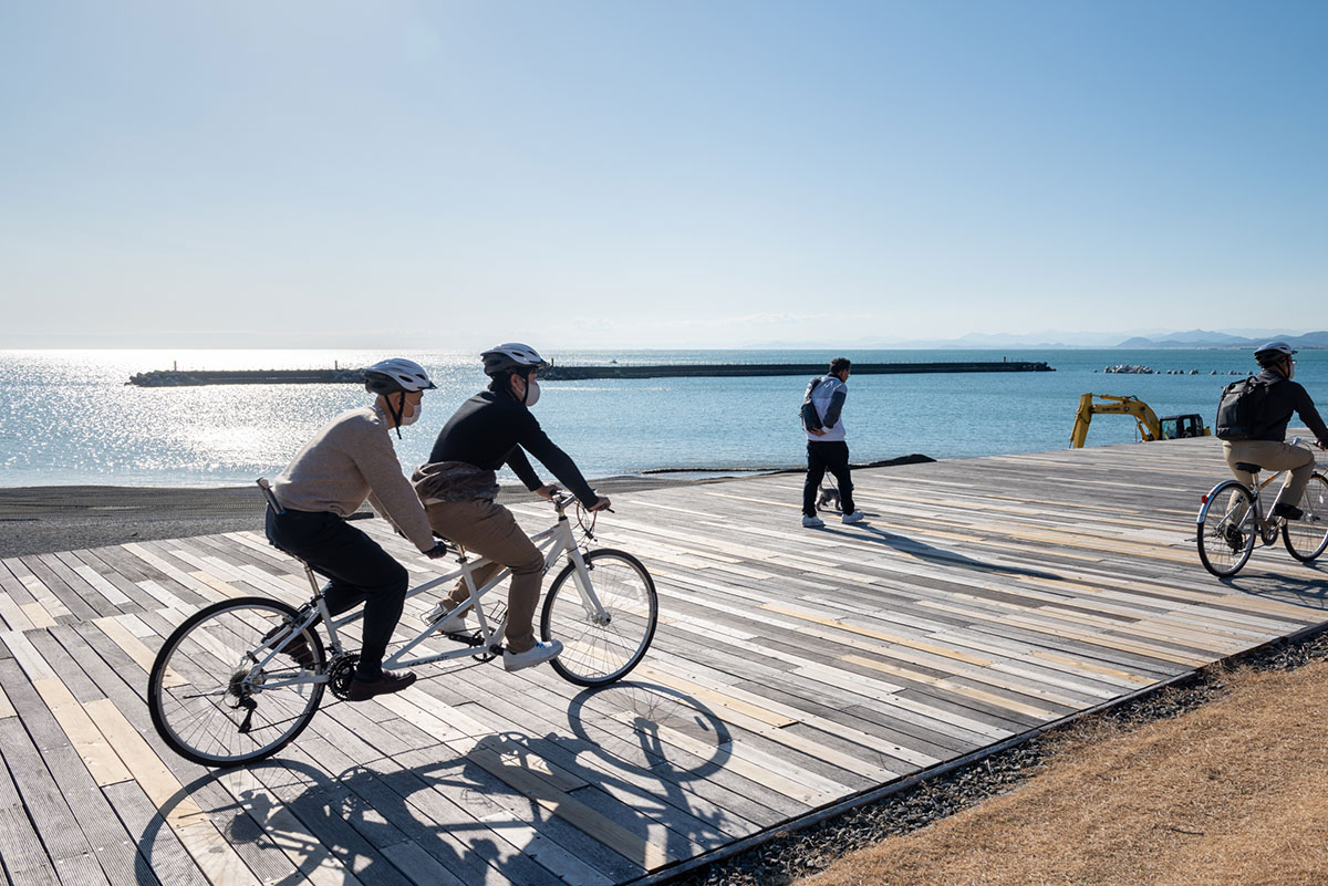 香南市サイクリングターミナルで、2人乗りのタンデム自転車をレンタルしました。ハンドル操作やブレーキは前の座席で行うため、視覚障害がある場合は介助者の方が前の座席に乗車した方が安全です。ターミナル前で少し練習をしてから、サイクリングロードをヤ・シィパーク方面に向けて出発しました。海の匂いや風、潮騒の音を感じながらのサイクリングはとても気持ちがよかったです。